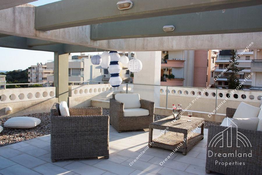 VARKIZA, Luxurious Penthouse Apartment 156 sqm., 3rd Floor with Exclusive Terrace Use with Kitchen, Furnished, 3 Large Bedrooms (1 Master), Furnished, Spacious Living Room, Separate Kitchen, 2 Bathrooms, W.C., Autonomous Heating with Petroleum, Air Conditioning, Fireplace, Security Door, Storage Room, Security Alarm, Tents, Solar Water Heater, Double Glazed Windows, CCTV, Comfortable Terrace, Quiet Neighborhood, Unlimited View, Sea & Mountain View, Near Market, Underground Parking, Price 850.000 Euros, (Listing code: 4487).